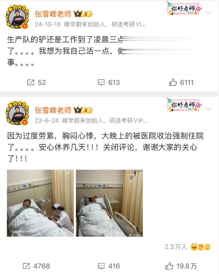 2023年6月,张雪峰曾在个人社交平台表示,因为过度劳累、胸闷心悸,被医院收治强制住院。